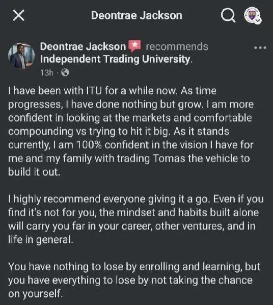 Discover how Independent Trading University has transformed the lives of traders around the world. From mastering the markets to building unshakable confidence, hear firsthand testimonials from ITU students who’ve leveled up their skills, mindset, and results. Ready to write your own success story? Start your journey today with ITU.